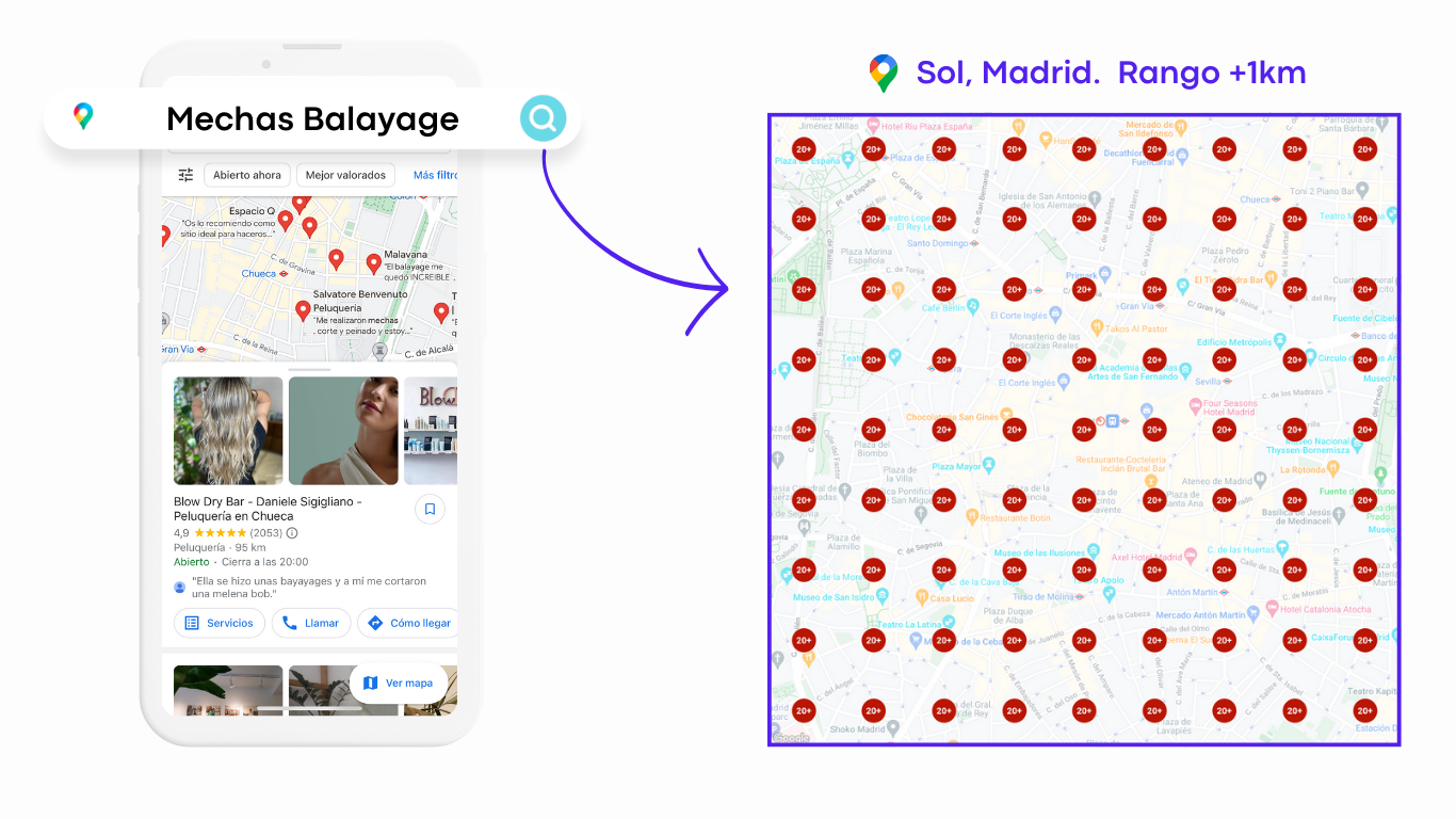 Para conocer el posicionamiento local de las peluquerías, hemos realizado una búsqueda por ubicación como si se tratara de un cliente interesado en realizarse unas “mechas balaye” en la zona de Sol, Madrid. Esta búsqueda geolocalizada a través de un Local Search Grid nos permite identificar a las 10 peluquerías más relevantes en Google para este tratamiento.